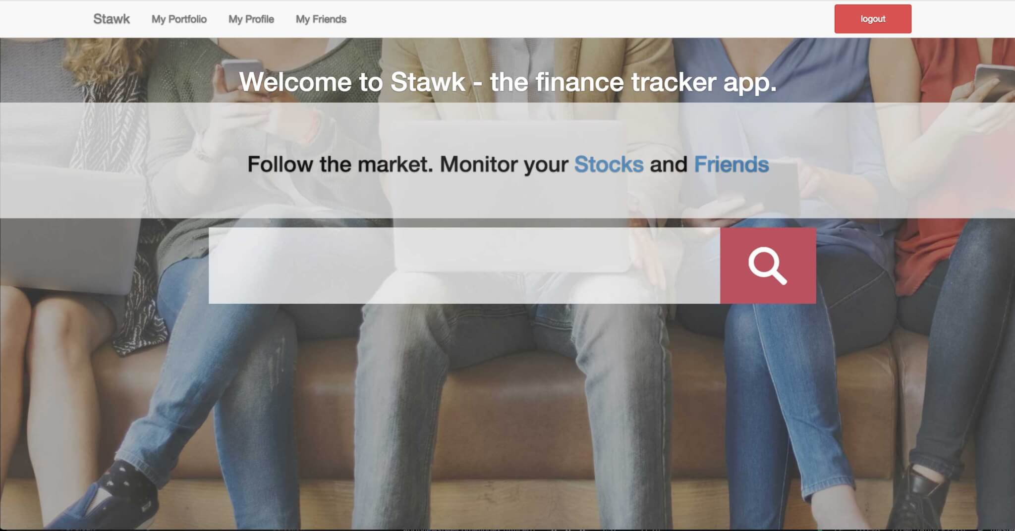 With Stawk, I was tasked with developing a full featured web application which included responsive interface, user authentication, searching functions, ability to lookup stocks and other users of the application and add them as friends. This application required the use of GIT, Postgres database and a live production application hosted on the web.